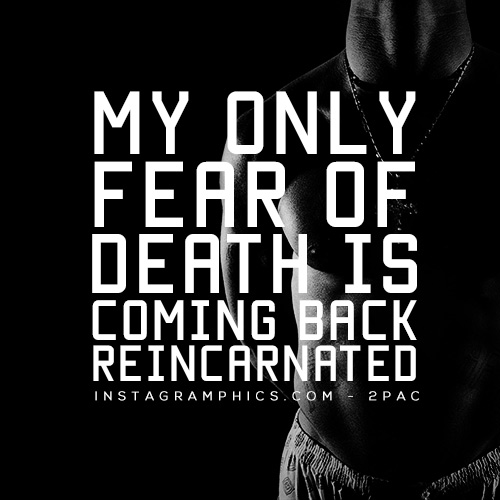 My only fear of death is reincarnation 2pac Follow their account to see 29 posts. I would rather die a meaningful death than to live a meaningless life. Lemika Log Out And i truly belive i was trying to reach my future self in my past life thru my music. I aint scared to die Only fear of death. Hussein Fatal I keep my heater on safety Ive been shooting rocks lately Everybody dies they nickel plates dont penetrate me I was suppose to be the murder first to go Them niggas missed and raised my blicks and now its personal. Email protected 1 913 522 5256. She remarked that he had a birthmark on his. This composition be my prophecy I hope its heard Verse 1. And Big Kill RIP.