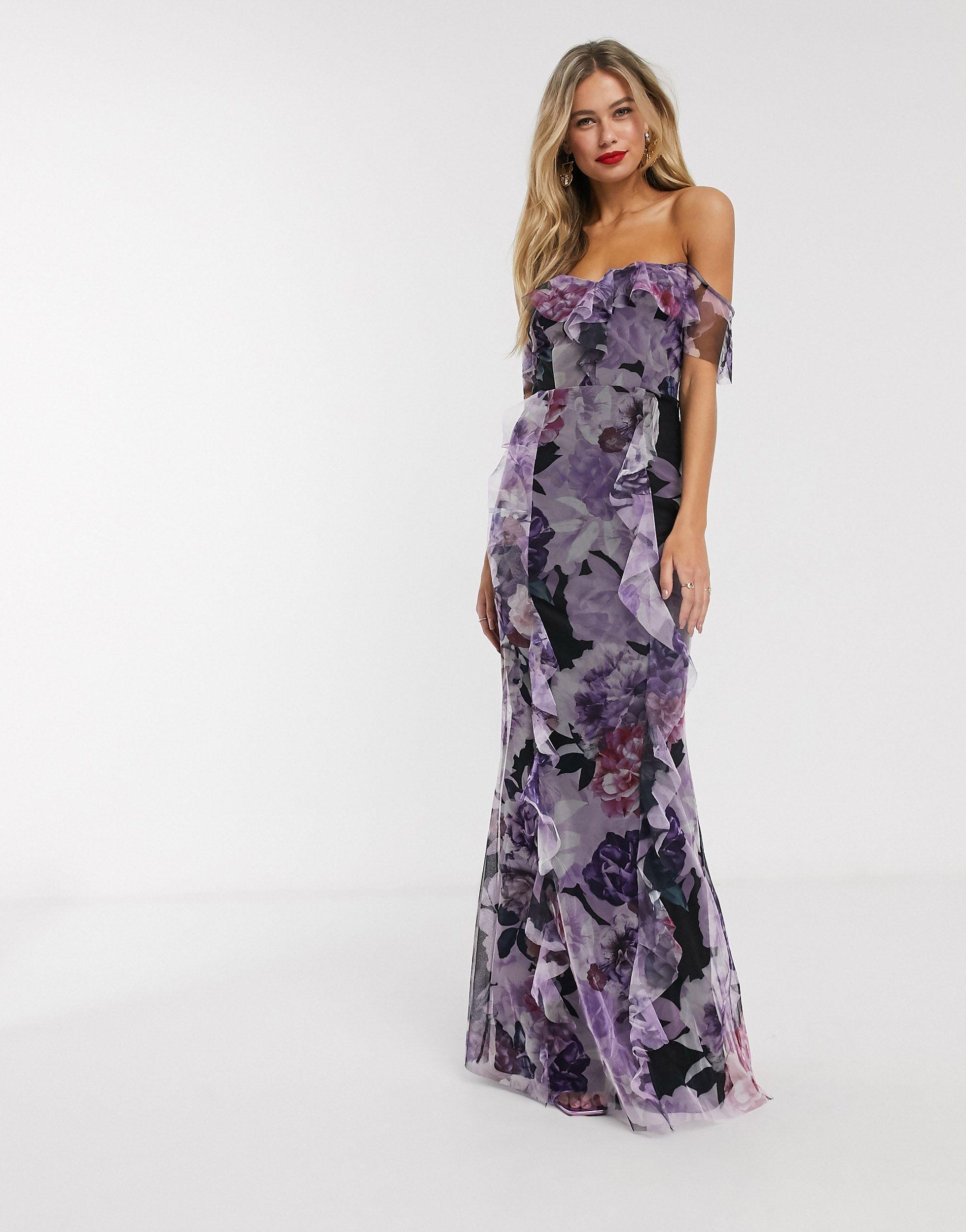 Lace Beads exclusive off shoulder tulle maxi dress in purple 100. If your gypsy spirit longs for adventure then its time to set sail in the Coast Traveler Purple Print Off-the-Shoulder Maxi Dress.