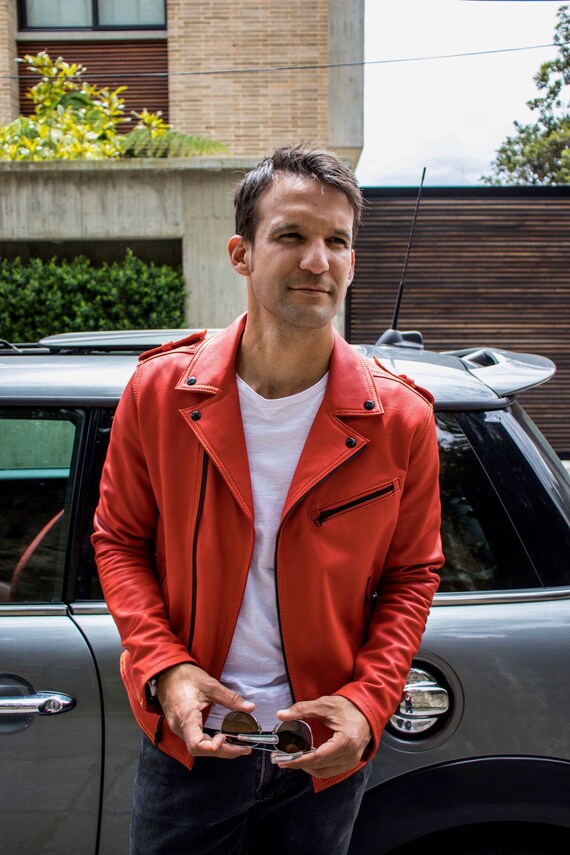 Looking For Leather Coats And Costumes Then You Are On The Right PlaceBuy Now Cheap PriceBiker Style Orange Leather Jacket Men With Free Worldwide Shipping. 4 Front Zipped Pockets - Front Zip Closure Stand Collars with Belt Fastening This Traditional Bike Style Jacket is crafted from Soft Supple Genuine Leather Leather Dry Clean Only Fastening. DISCOUNTED PRICE ON EVERY SIZE Genuine Leather Biker Jacket MADE FOR YOU ONLY When you order this jacket our tailors will.