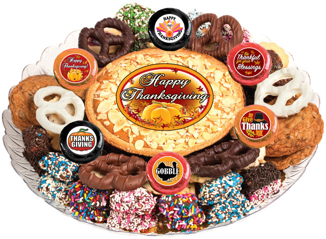A custom label or hang tag that says anything you want can be added. It looks and taste amazing. Barbaras Thanksgiving Cookie Pie Cookie Platter is our Grand Supreme and contains our signature Cookie Pie in the center of the platter surrounded by a multitude of delicious gourmet treats such as Barbaras best-selling JoeyJoy Gourmet Butter Cookies foil-wrapped chocolate Oreo and Graham cookies double-dipped Chocolate Pretzels our famous Chocolate-Dipped.